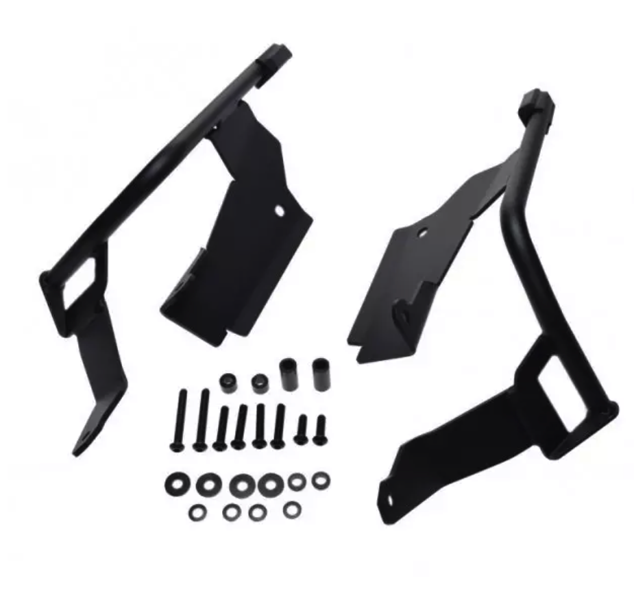Este kit está composto por duas paletas SH36 Simil Carbono "uma esquerda e uma direita" junto com um jogo de Cerraduras e o suporte específico da moto.