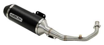 O Escape Completo composto por Silencioso de escape da marca Arrow, feito em alumínio com cor preta e peso reduzido, também inclui coletor de escape em aço inoxidável, para a Kawasaki J300 de 2014 a 2016. Ref: 53506ANN