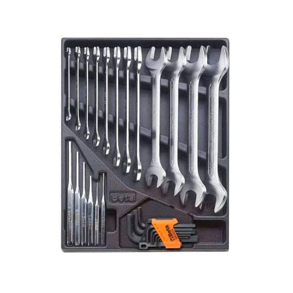 A Beta apresenta seu conjunto de chaves planas, chaves Allen, êmbolos e punção, perfeitamente organizadas nesta bandeja de plástico rígido, ideal para instalar no seu carrinho de ferramentas.