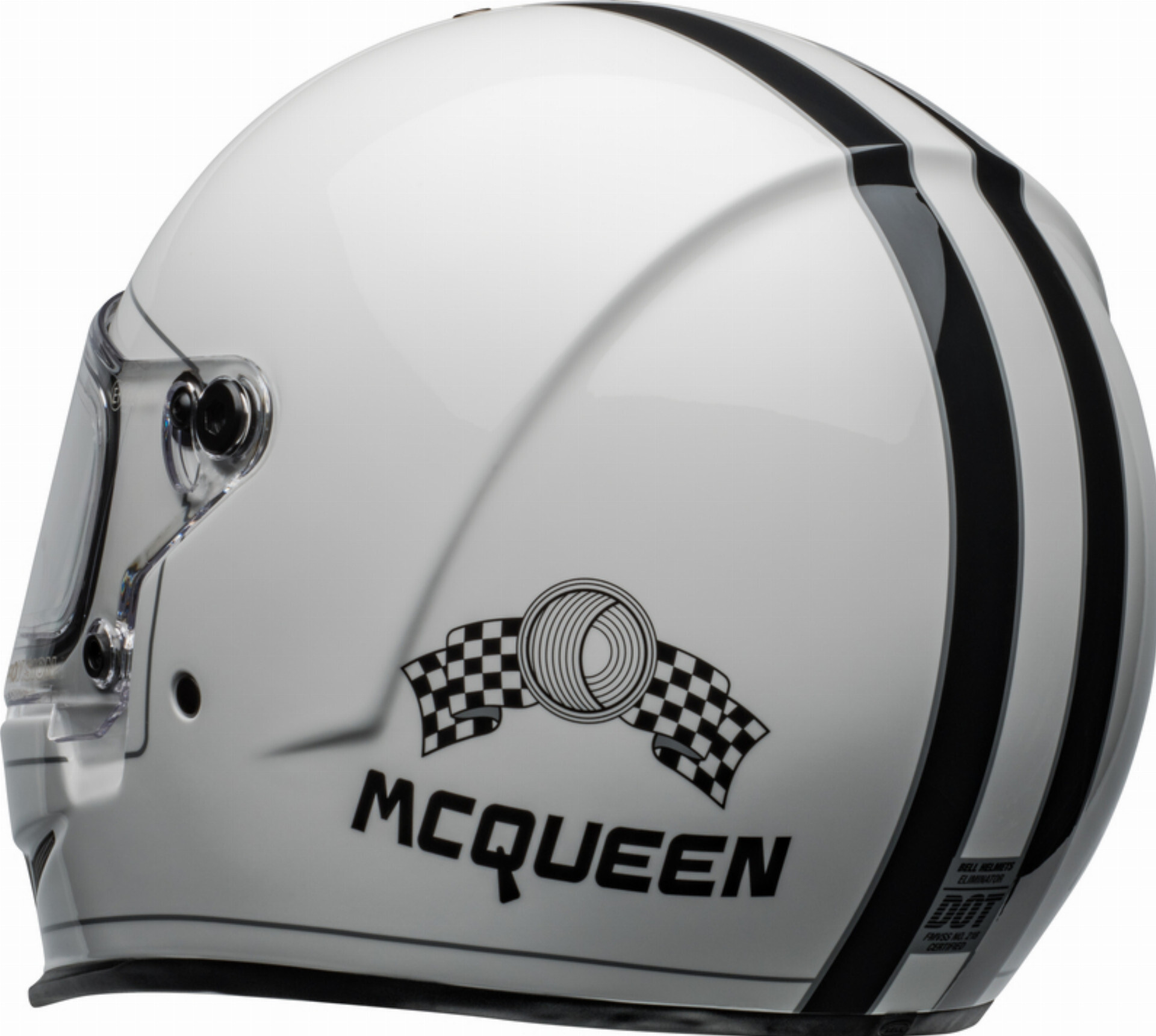 Capacete integral Bell Eliminator Steve McQueen, unissex, em preto e branco com fecho de fivela dupla. Fabricado em fibra com acabamento brilhante e homologação ECE 22-06 para homem.