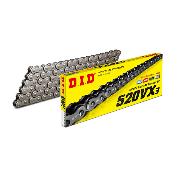 As correntes da série DID 520VX3 são projetadas para fazer a diferença em sua motocicleta como uma solução de corrente universal para motocicletas de estrada e off-road de até 800cc.
