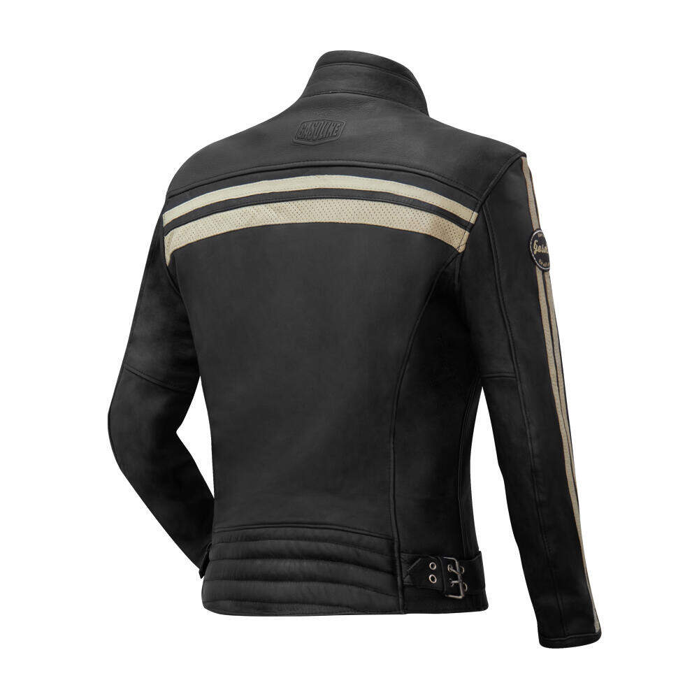 Jaqueta de motociclista feminina Enfield. Um painel acolchoado de couro na parte inferior das costas acentua seu visual retrô.