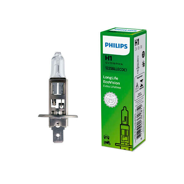 Melhore a sua visão com esta lâmpada plana Philips H1 LongLife EcoVision com 55 W 12 V e tomada P14,5 S. Esta lâmpada melhora a sua visão, aumentando assim a sua segurança na estrada, quer esteja a viajar de moto ou de carro.