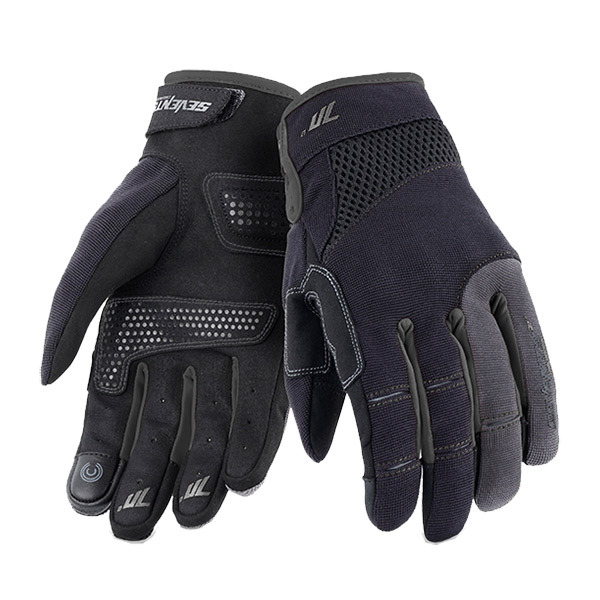 A Seventy Degrees apresenta estas luvas de verão para motociclistas com tecido tátil no dedo indicador e velcro para um melhor ajuste.