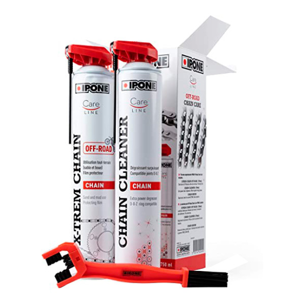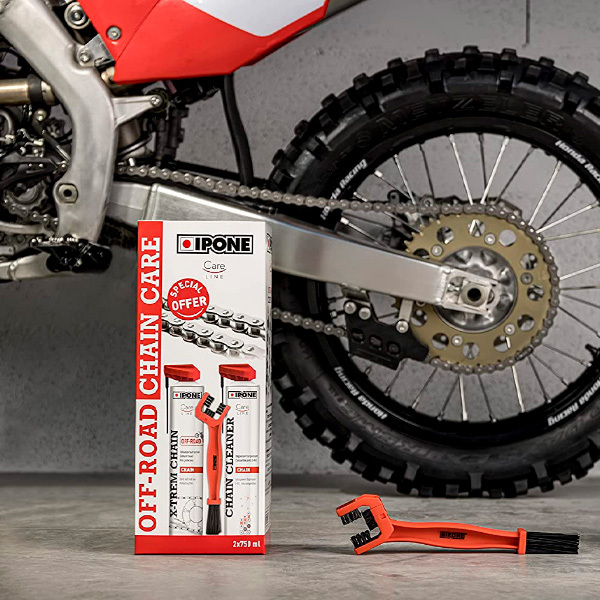 A Ipone apresenta o seu pack de limpeza de correntes para motos Care Cleaner Xtrem Off-Road + Escova para uma manutenção eficiente, perfeita para condições de correntes de alta performance, para motos de motocross, enduro e Off-Road.